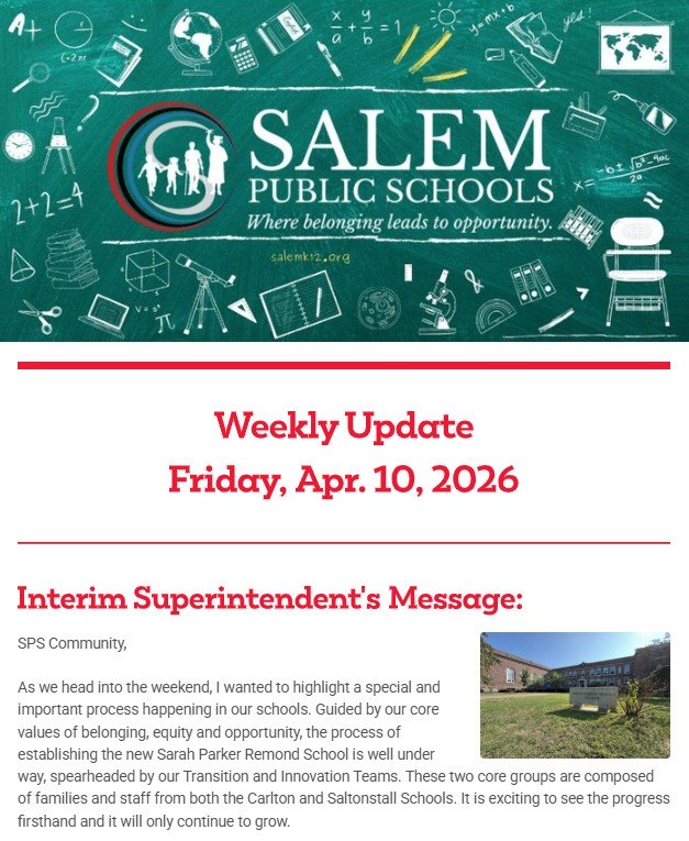 Salem Public Schools is a diverse and welcoming community that promotes each student’s academic, social, emotional, and physical development through the equitable delivery of challenging, relevant, and joyful learning experiences. We empower all students to chart a personalized path to success which includes a commitment to the common good.