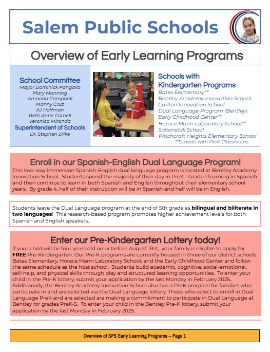 Salem Public Schools has expanded its offerings for early learning — preschool, pre-kindergarten and kindergarten — significantly over the past year. Our Overview of Early Learning Programs is a comprehensive resource to guide our families through every step of the early education process from registration, transportation and after-school programming.