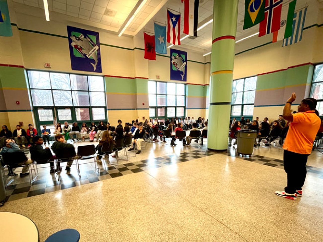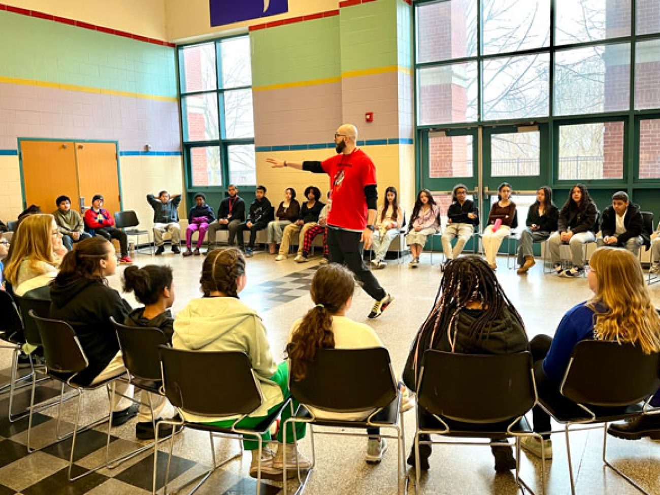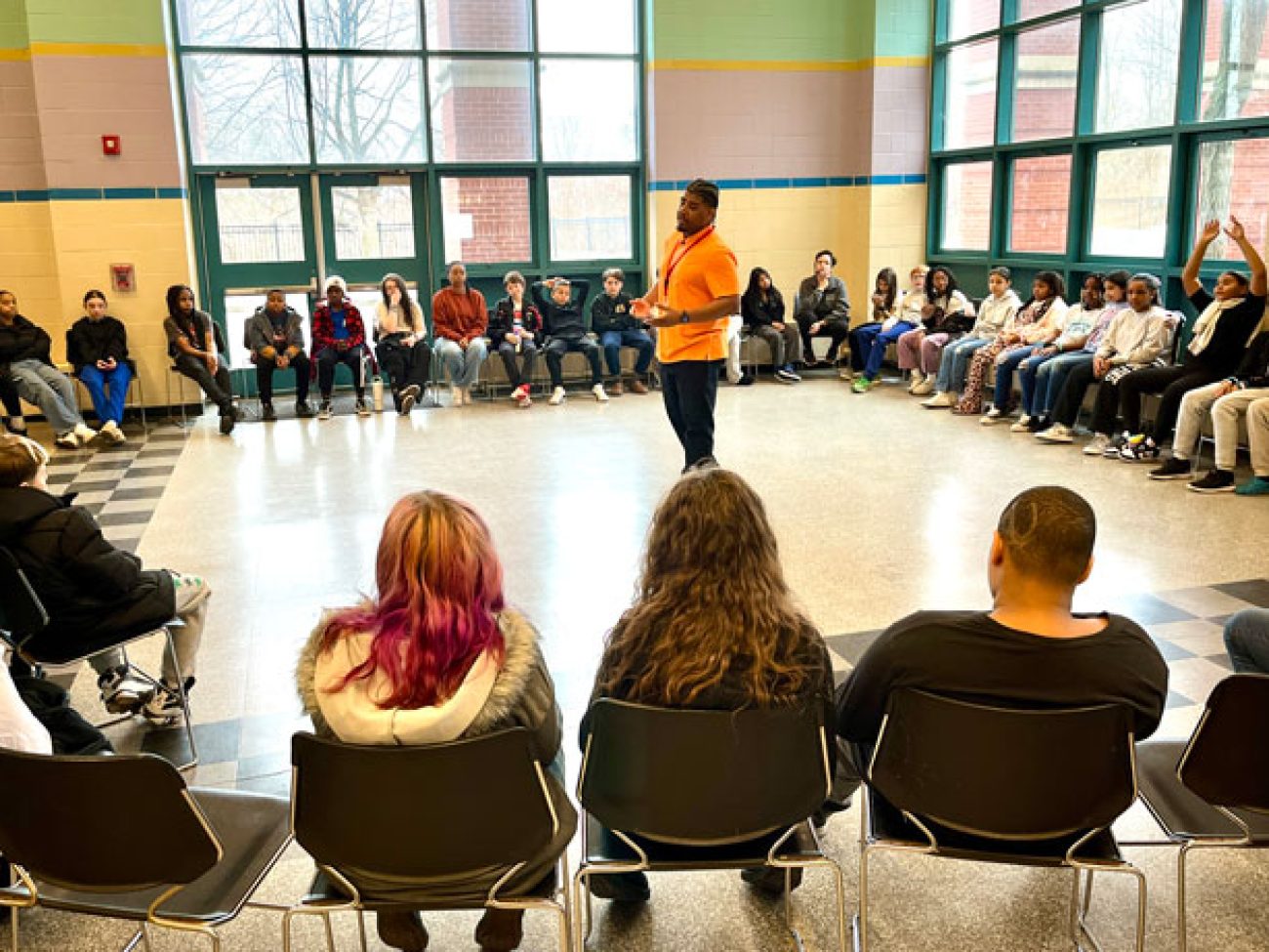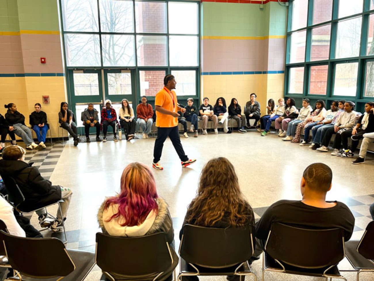 Under the leadership of Dean of Students and School Culture Terrell Greene, Collins Middle School sixth grade scholars gathered in two large circles Wednesday morning to discuss how they are affected when unkind situations arise. To put them in the right mindset, Mr. Greene and Student Support Advisor Giannis Panagiatopoulos engaged students in a game of ‘When the Wind Blows,’ spurring them to move seats and sit among different peers when presented with situations and how they were impacted.