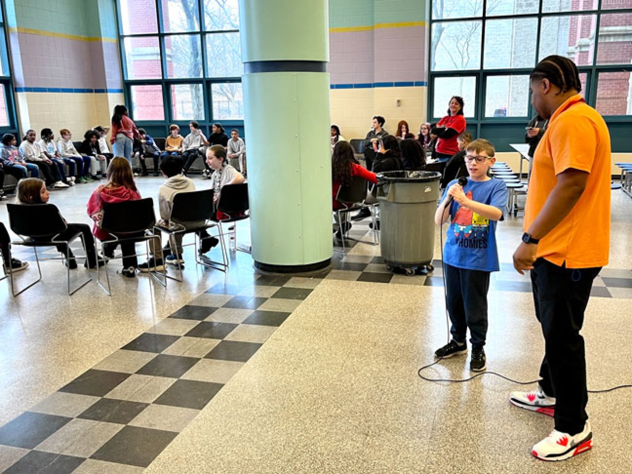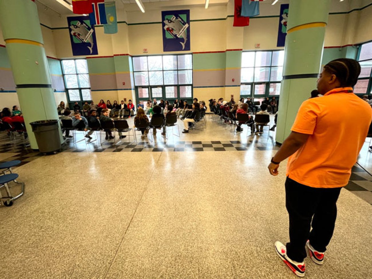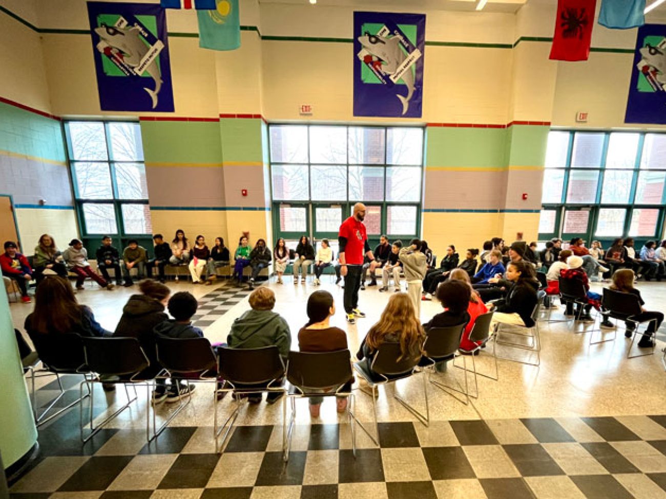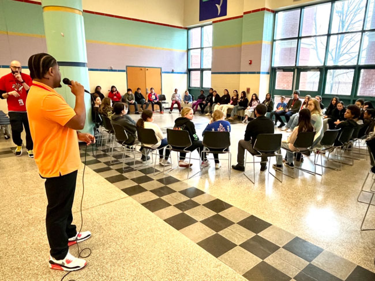 Under the leadership of Dean of Students and School Culture Terrell Greene, Collins Middle School sixth grade scholars gathered in two large circles Wednesday morning to discuss how they are affected when unkind situations arise. To put them in the right mindset, Mr. Greene and Student Support Advisor Giannis Panagiatopoulos engaged students in a game of ‘When the Wind Blows,’ spurring them to move seats and sit among different peers when presented with situations and how they were impacted.