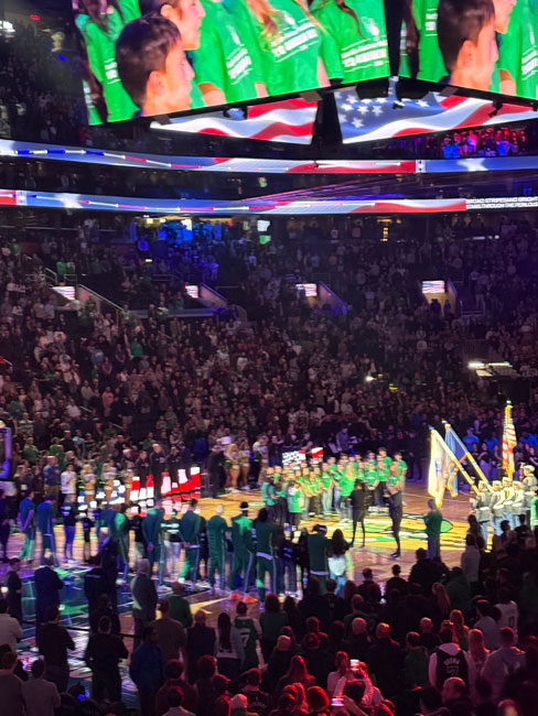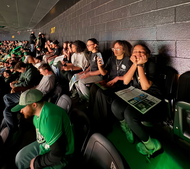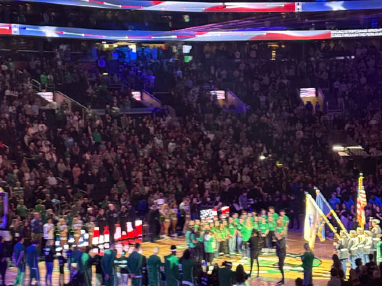 CMS students and staff were on the parquet floor were before the game and during the national anthem, mixing with Celtics players and members of its dance squad, and even a few members of the Hornets.