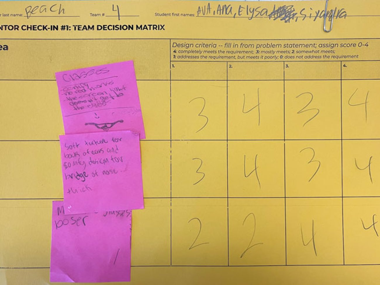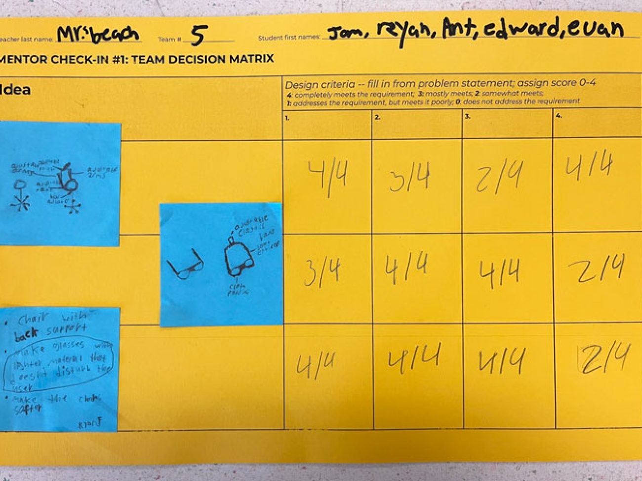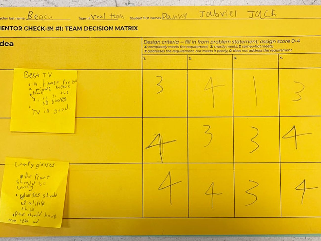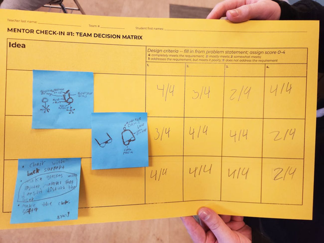 - At 10:30, teams began research to develop their three ideas using their Decision Matrix Tool, which measures ideas in relation to solutions.