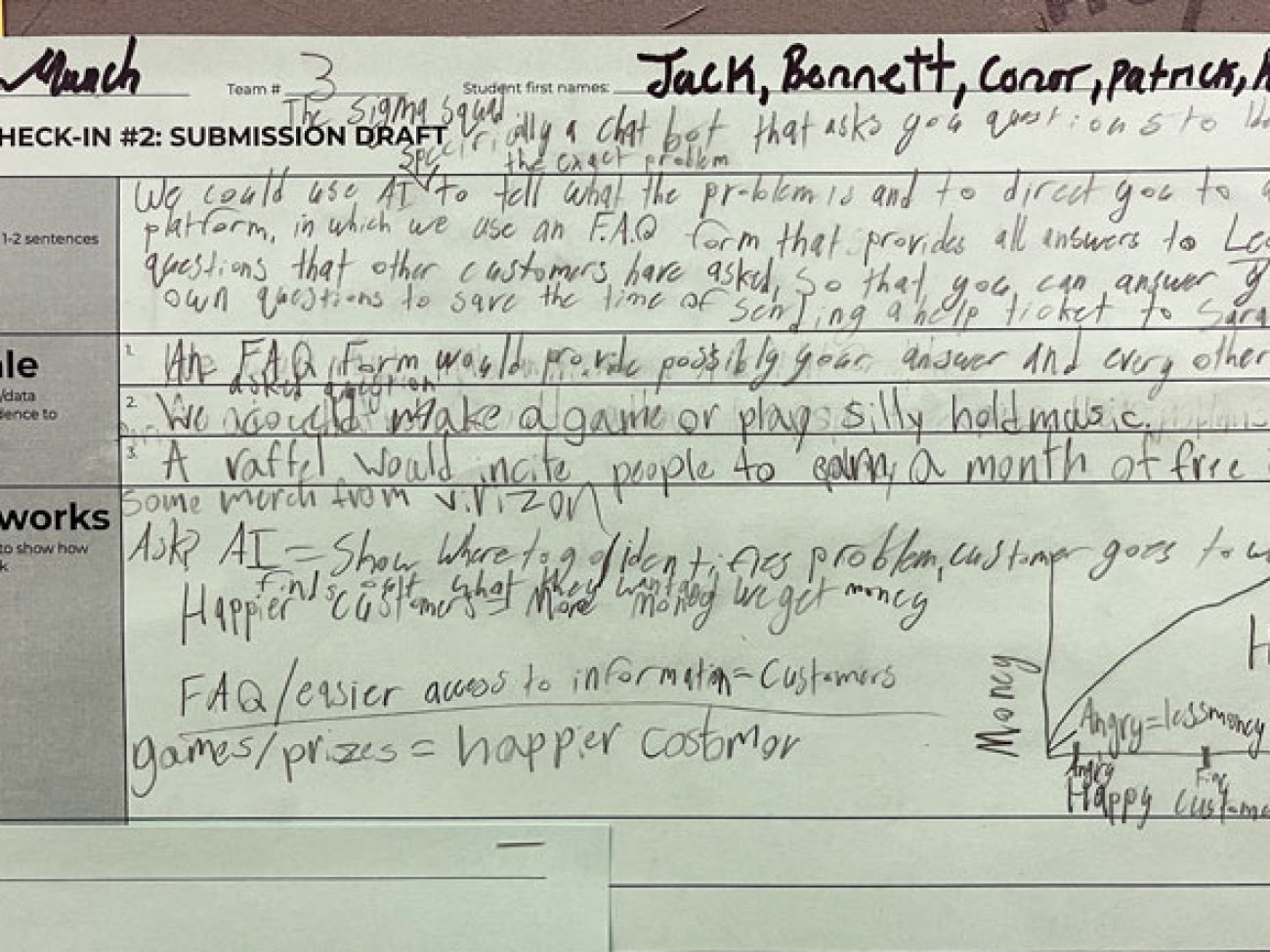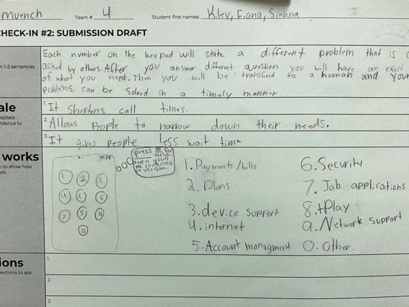 Students assigned to help Verizon emerged with several novel ideas. Among them, the use of chatbots to communicate with customers and redirect them to a frequently asked questions (FAQ) page to find solutions. This particular group also suggested incentivizing the self-help process with a raffle or merchandise as a reward.