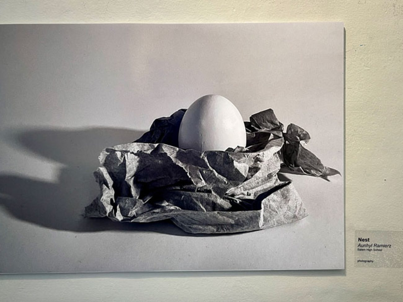 • Freshman Aunhyl Ramirez with her unique image titled ‘Nest,’ depicting an egg creatively surrounded by crepe paper in black and white with dominant shadow.