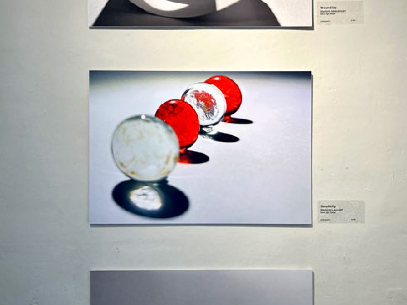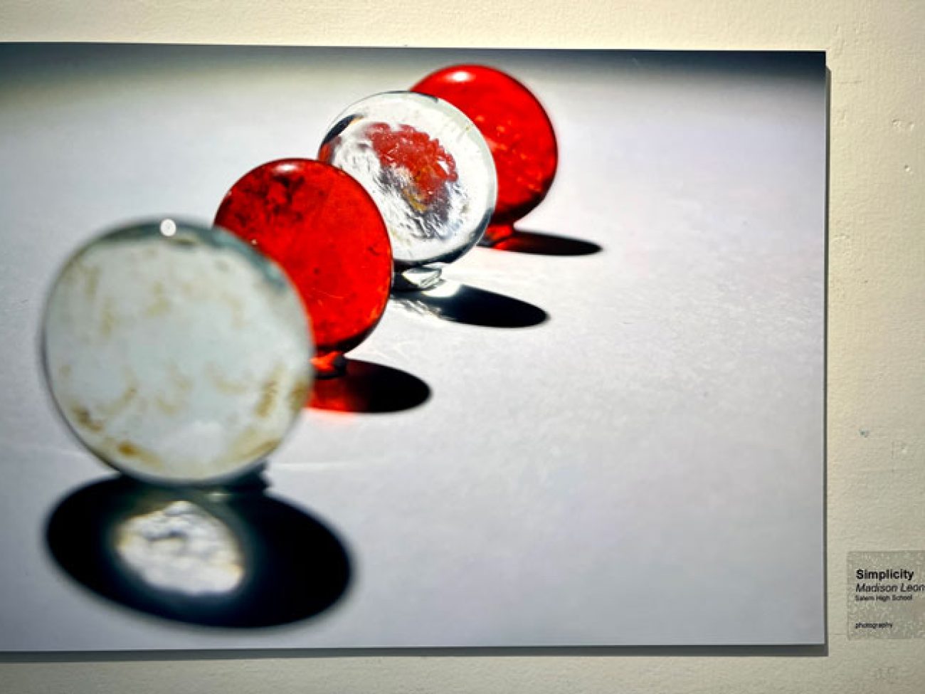 • Freshman Madison Leonard for the colorful ‘Simplicity,’ featuring perfectly diagonally lined red and clear glass orbs against a black and white backdrop.