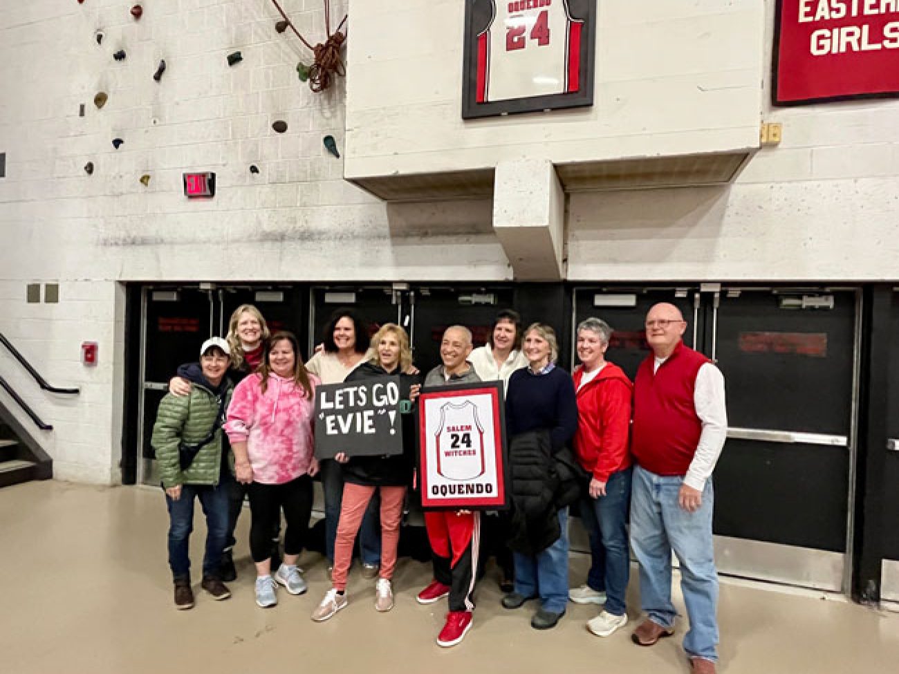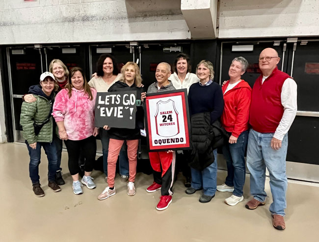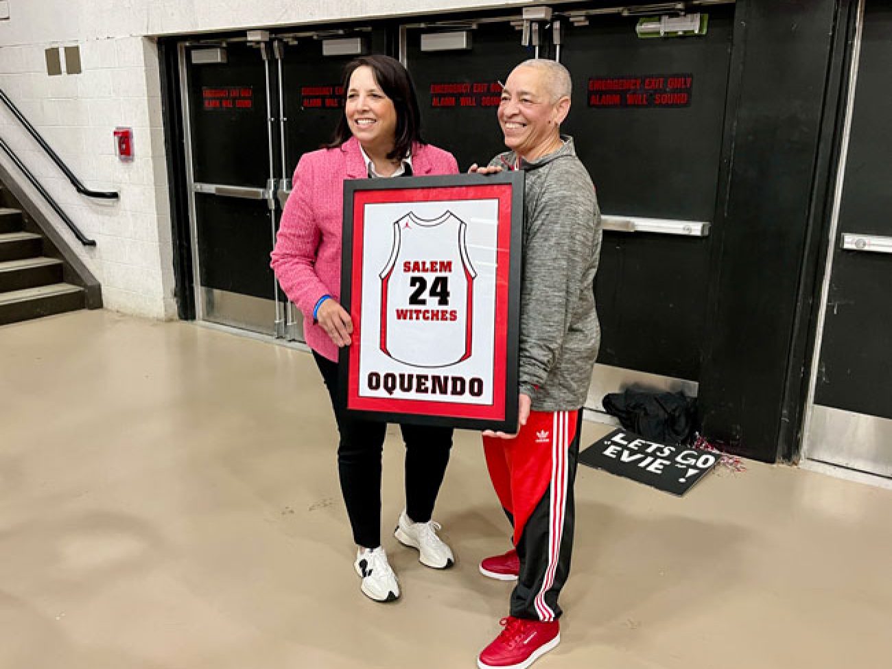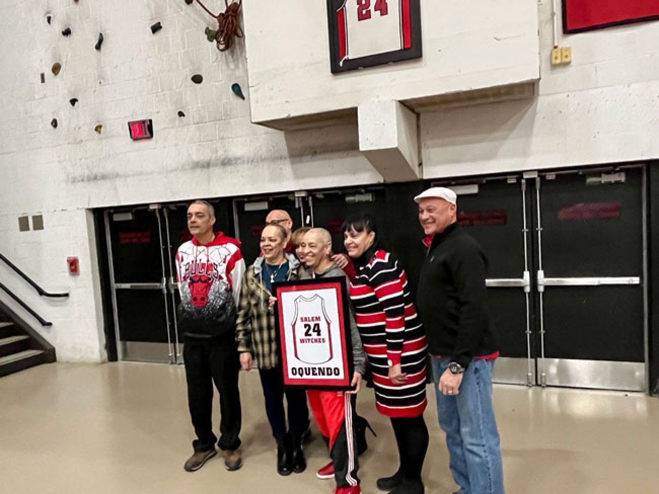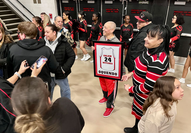 Evelyn Oquendo ’82 joined former Witches standouts Rick Brunson ’91 and Scoonie Penn ’96 when her No. 24 jersey was retired Friday night in front of well over 100 co-workers, community and state leaders, former SHS and Salem State teammates, school committee members and family at the Veterans Memorial Field House.