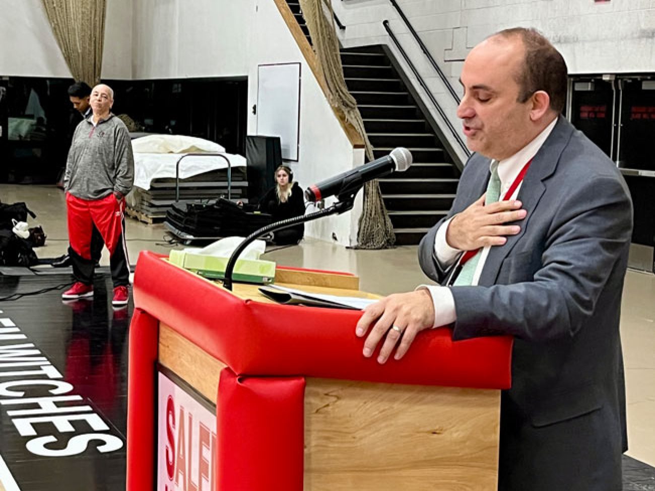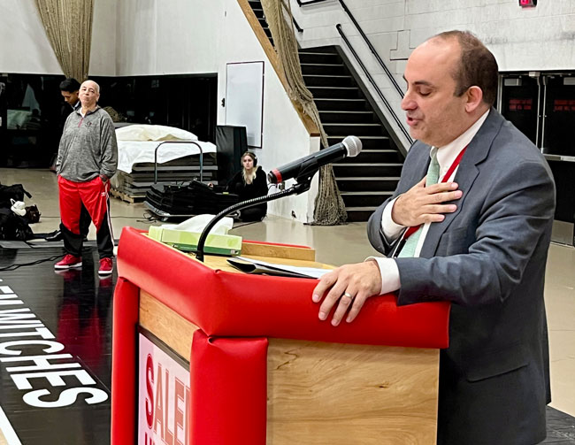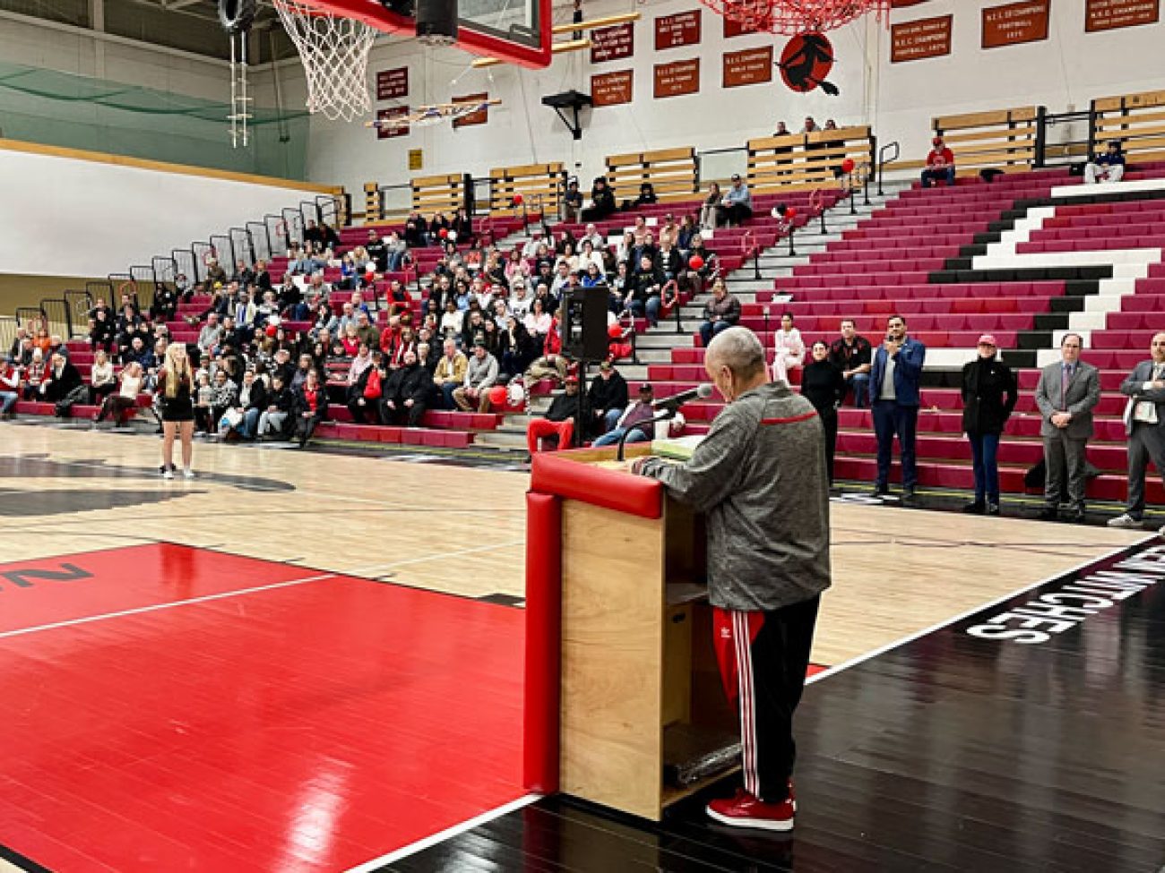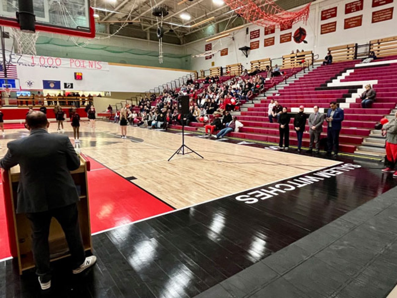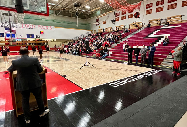 Evelyn Oquendo ’82 joined former Witches standouts Rick Brunson ’91 and Scoonie Penn ’96 when her No. 24 jersey was retired Friday night in front of well over 100 co-workers, community and state leaders, former SHS and Salem State teammates, school committee members and family at the Veterans Memorial Field House.