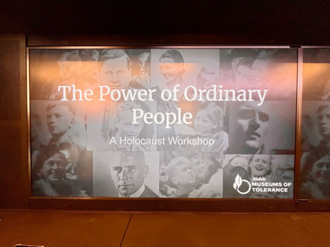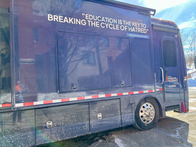 The Mobile Museums of Tolerance, making Salem Public Schools its first stop in Massachusetts, was parked in front of the main entrance to the school Monday and Tuesday, educating eighth grade students on tolerance. As part of the English Language Arts (ELA) curriculum, students spent the hour learning about tolerance, watching a film depicting how Adolf Hitler came to power in 1930s Germany, the impact of propaganda, with a discussion afterward.