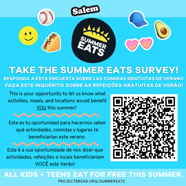 Let’s get ready for Summer! It’s now April, and summer is approaching quickly! Salem Food and Nutrition Services is hard at work putting together our summer programming for this year. We are planning meals to be served, the summer kickoff event, and activities to include at our sites throughout the summer. This year we want the summer sites to be a place where kids can come to eat, socialize and have fun without parents having to worry about any additional cost! We are launching a survey for the Salem community to learn more about what our community would like to see at these sites and also locations and times that would work best for meals to be served and activities to be held. We greatly appreciate the community’s participation in this survey, as this will lead us all to a successful and fun summer. Take the survey here.