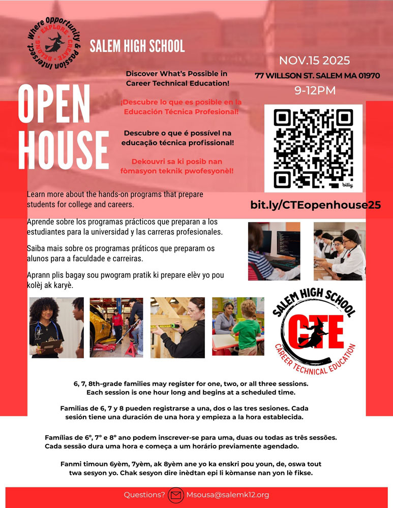 The Salem High School Career Technical Education (CTE) Department will host its 2025 Open House to grades 6-8 families Saturday, Nov. 15 (9 a.m.-12 p.m.) at its CTE facilities at the High School.