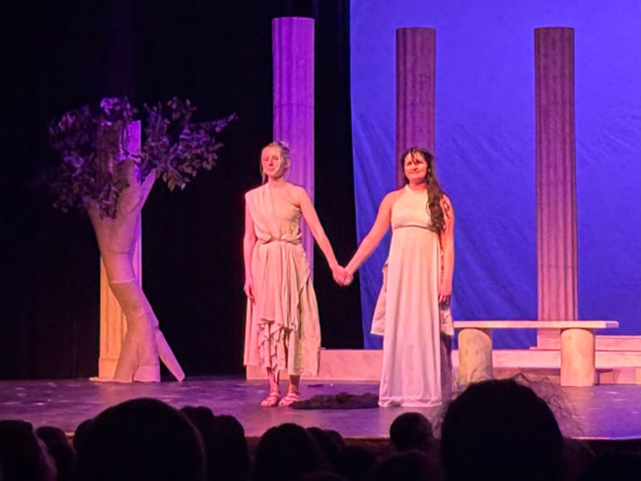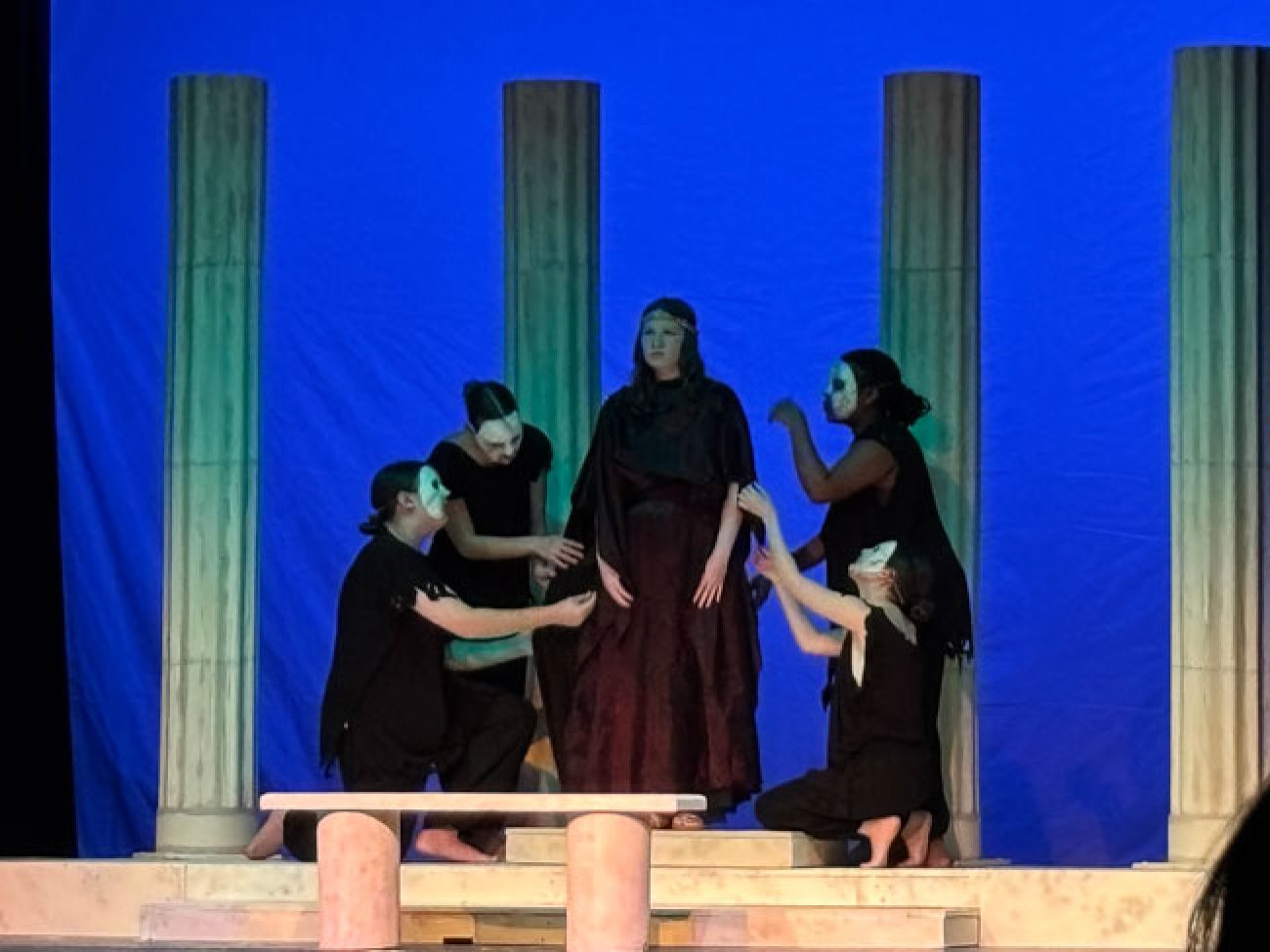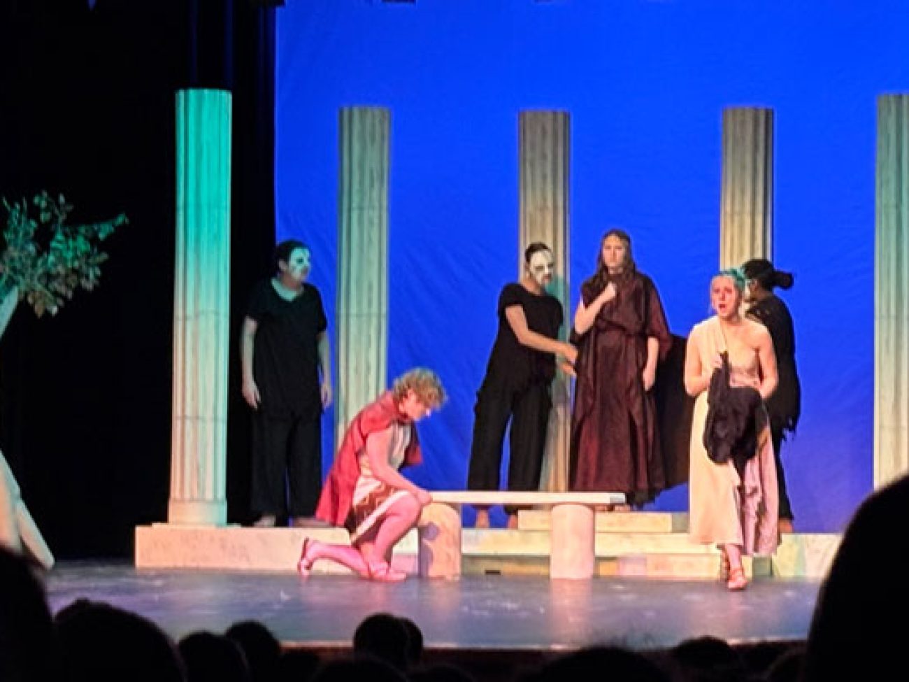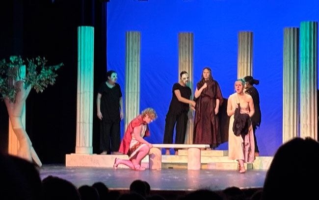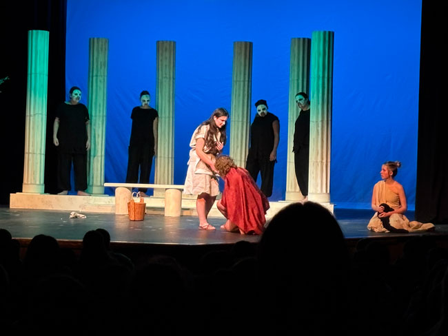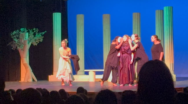 “Our show this year leaned into a simple but stylized concept, with scenery, sound, costumes, and a movement-based masked chorus inspired by Greek Theatre,” Ms. French said. “I chose the show to allow many of our senior technical students to shine, in addition to providing great opportunities for our actors. Ella Jackson’s scenic design, Clover Borne Lyon’s hand stitched costumes, sound design by Sam Mulligan (with assistance from Raymond Nguyen), and lighting by Lizzy Mahady all came together to create a cohesive moment of storytelling that aligned with our actors’ physical and vocal choices.