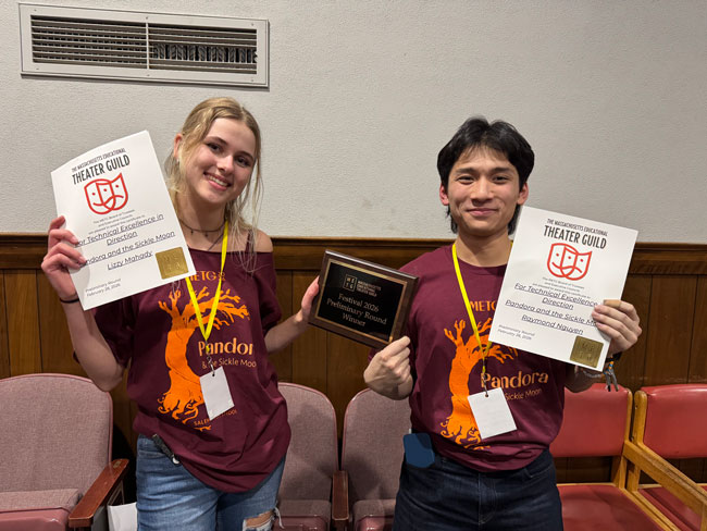 DANVERS (Mar. 4, 2025) – Seniors August Hunter and Charlie Feldmann Conners both won Excellence in Acting Awards as the Salem High School Drama Club advanced to the semifinal round of the Massachusetts Educational Theater Guild (METG) High School Drama Festival Saturday at St. John’s Preparatory School.