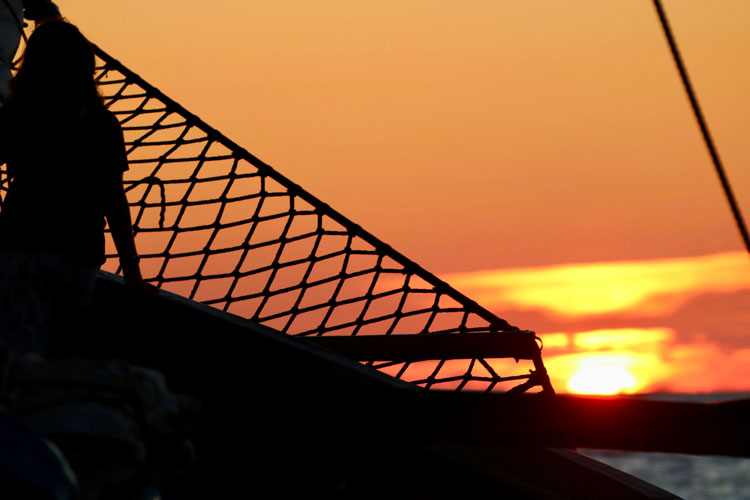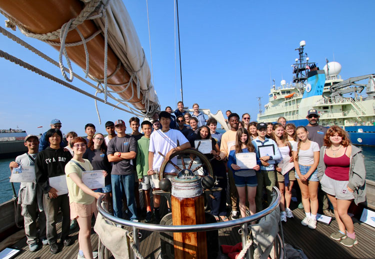 Following two days of training, the SSV Corwith Cramer navigated from Martha’s Vineyard north to the Gulf of Maine. Teams of students rotated shifts, the many tasks involved repeated lifeboat functioning checks, organizing lines and deploying sails, serving as lookout for vessels and buoys, and observing activity in the engine room below deck.