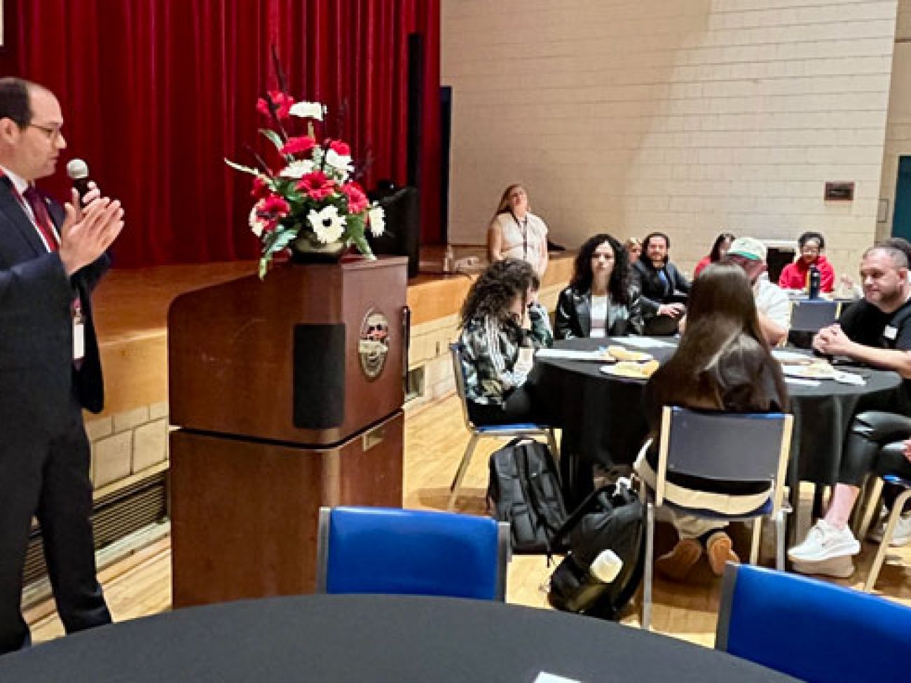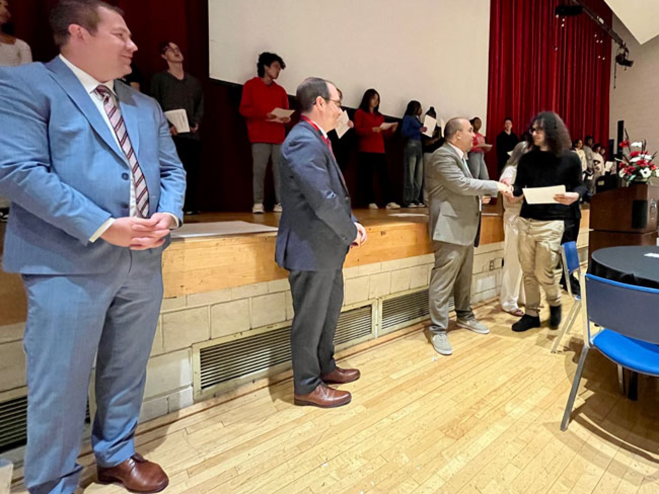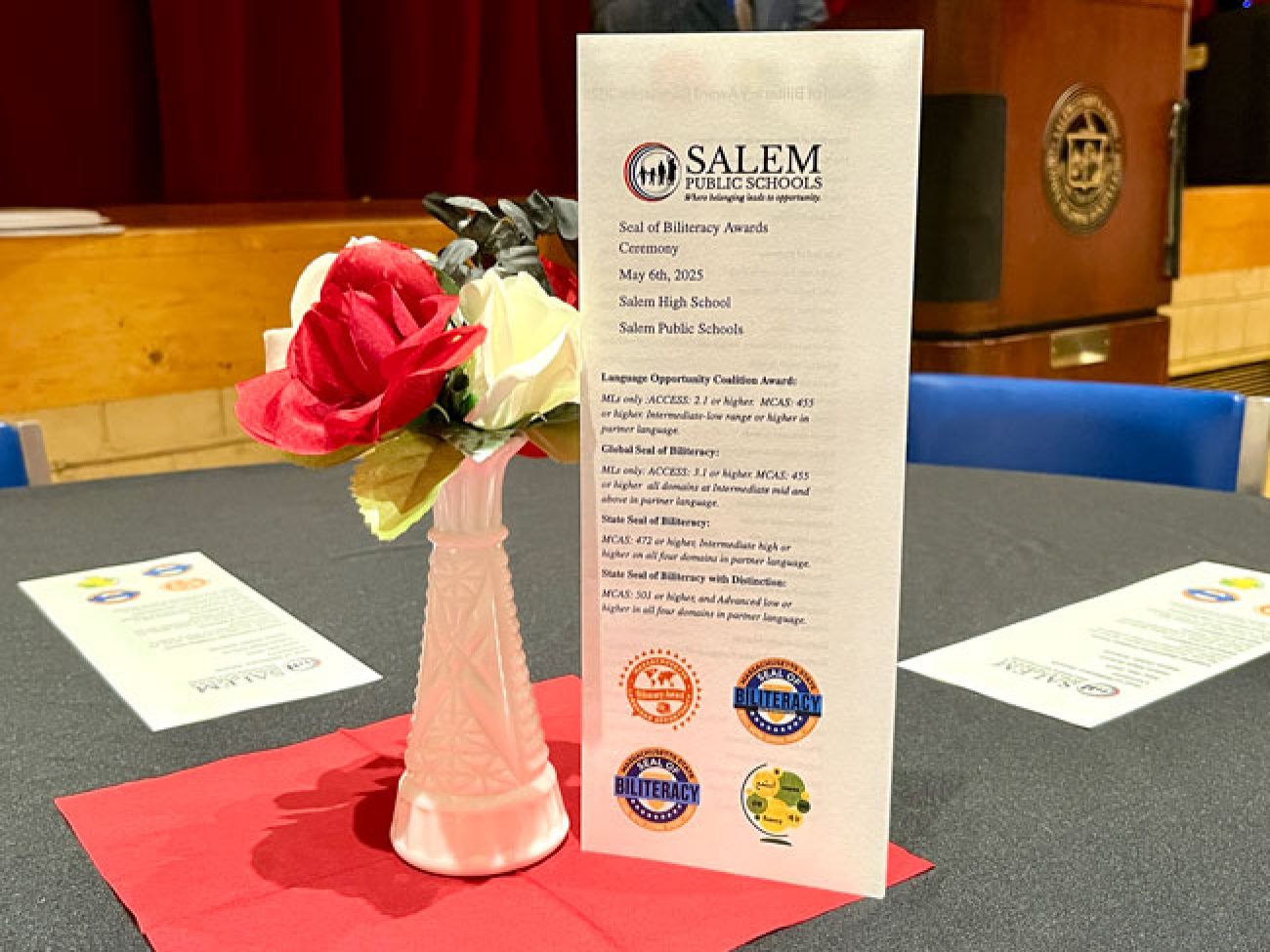 SALEM (May 7, 2025) – Juniors Sindi Sula, Guywintz Jules, Morissa Binns and Ajlin Kodheli each earned the Massachusetts Department of Secondary and Elementary Education (DESE) State Seal of Biliteracy with Distinction and led a record 64 Salem High School students who earned similar honors in a ceremony Tuesday morning at the SHS M. Ruth Norton Auditorium.