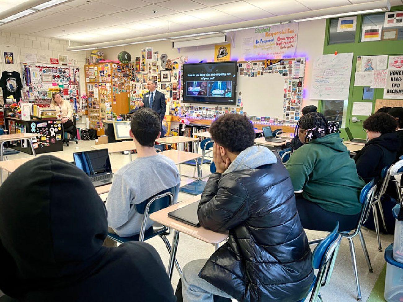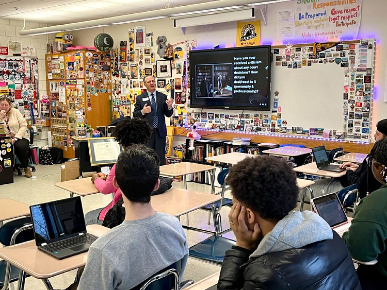 Tabit was invited to Salem High teacher Lori Marenda’s criminal justice class as a part of Massachusetts’ Judicial Outreach Month, an annual initiative when judges engage with communities across the state about their work in the judicial branch and the importance of impartial and independent judiciaries to a functioning democracy.